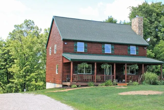 Come home, or home-away-from-home, to southeast Ohio's historic tourist destination! This newer log-sided home was originally used as a personal home by the builder, and features a full classic covered front porch plus spacious rear deck overlooking tall trees and other greenery, with views front and back across lots of level space for play and entertaining. Enjoy super sunsets from the porch, and of course special sunrises from the back! Discover this appealing property in popular Big Pine Estates, surrounded by similar log and wood homes...just minutes away from city amenities in Logan, as well as the natural wonders of Hocking Hills State Park. Step inside to appreciate the soaring ceiling, wood walls, extra windows, large family gathering space with wood-burning fireplace, open dining space with deck walkout, cooks-delight XXL kitchen w/crowd-pleasing breakfast bar, and spacious loft. 1st-floor master, walkout lower level includes finished room currently as 4th bedroom, or possible den.