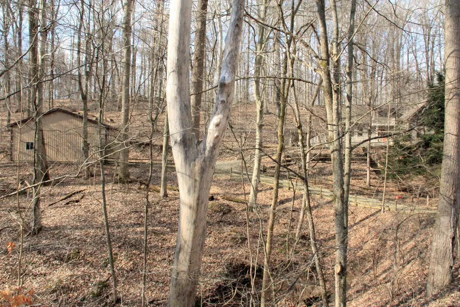 *SOLD - September 2016* Resort Lifestyle included, + 3 decidedly scenic lots, cul-de-sac, garage & 28x36 barn, wood storage area, spacious surround decking, and upper level loft walkout..adding up to one rustically charming exterior. Tucked away yet covenient to the main entrance in Hide-A-Way Hills, gated getaway to the famous Hocking Hills since 1961, this property offers a warm and natural invitation to head for "The Hills" either for home or home-away-from-home. And wait, of course there's more...inside you'll discover a soaring great room with woodstove & walls of windows overlooking nature, and featuring a stairway to a spacious upper haven complete with built-ins, long & lighted walk-in, full bath, sitting space, plus regular and oversized bedrooms with cubby storage spots & more. Also on the main level is a large galley-style kitchen, convenient half-bath, laundry room with storage, private den with walk-in, and spacious master suite with its own private side walkout. Garage is nicely finished, too!