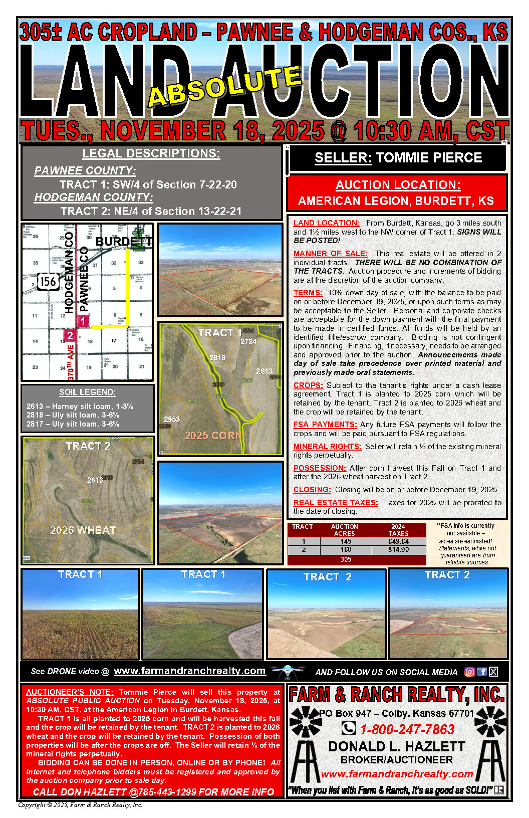 Tommie Pierce will sell this property at ABSOLUTE PUBLIC AUCTION on Tuesday, November 18, 2025, at 10:30 AM, CST, at the American Legion in Burdett, Kansas.