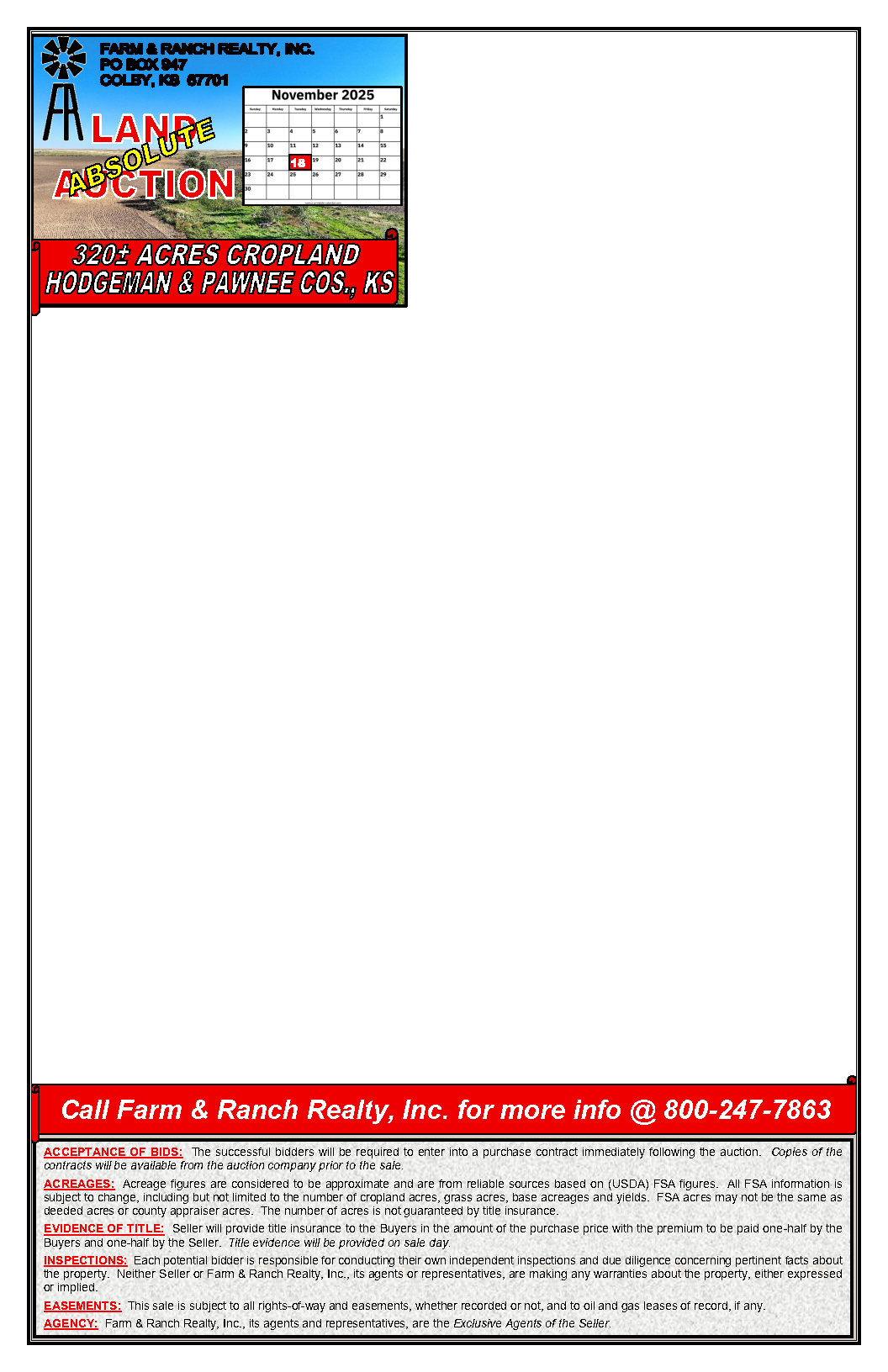 TRACT 1 is all planted to 2025 corn and will be harvested this fall and the crop will be retained by the tenant. TRACT 2 is planted to 2026 wheat and the crop will be retained by the tenant. Possession of both properties will be after the crops are off. The Seller will retain ½ of the mineral rights perpetually.