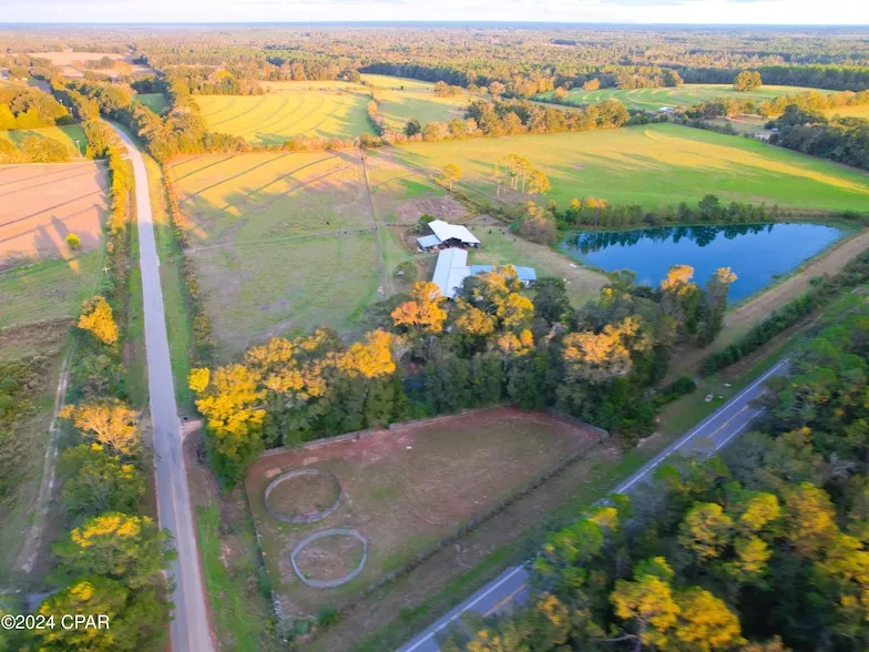 Welcome to an extraordinary opportunity for horse enthusiasts and those seeking a pastoral haven. This property's history as a large animal veterinary clinic adds a unique touch to its charm. The home is seamlessly connected to the vet office and barn, creating a functional layout for horse-related businesses or livestock owners. Spanning 34 sprawling acres, the property includes a well-stocked pond and a spacious guest cottage measuring 880 square feet. The 17-stall horse barn features a tack room and feed room, while a separate building houses hay and equipment storage. A workshop with a concrete floor and electric supply adds versatility and the oversized garage accommodates two cars comfortably. The main house exudes coziness with two bedrooms and two baths. Inside, discover modern touches like granite counters and stainless steel appliances. A dedicated laundry room adds convenience to daily living. Under the current ownership, the property has undergone substantial improvements. The family revitalized the land through thoughtful fencing, hay field fertilization and enhancements to the turnout pastures. An orchard with various fruit trees now graces the landscape, and the pond's overflow has been enhanced for optimal functionality. Strategically positioned at the corner of Highway 160 and Highway 81, this estate offers easy access to I-10 and Ponce De Leon, making it a prime location. As an up-and-coming area, this beautiful farm presents an incredible opportunity for those seeking an equestrian lifestyle. With 34 acres of natural beauty and a range of amenities, including the custom-built main house and guest cottage, it's a haven for those who appreciate the charm of rural living. Enjoy tranquil screened porches, stunning pond views and ample space for all your equestrian pursuits, from stables to workshops and more. Explore the possibilities of your next chapter in this remarkable property with an Assumable Loan. Schedule a showing to envision your future here.