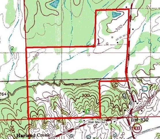 Timber consists of mixed age CRP pines and hardwood bottoms along Harland Creek, open pasture and pond.