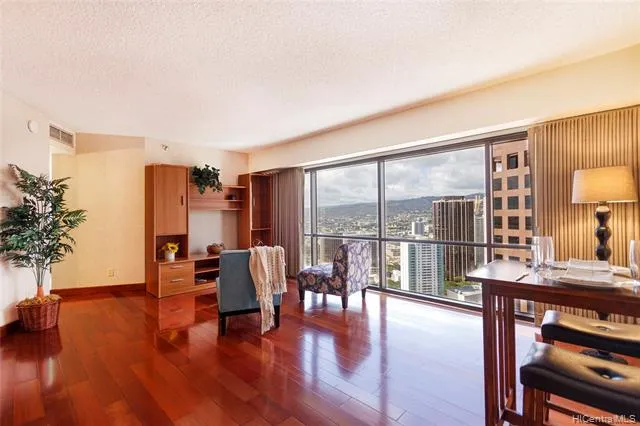 Located in downtown Honolulu's financial district, this apartment has it all. Convenience at your doorstep and the perfect downtown walk/work from home location with a dedicated parking stall. Walk to Longs, Ross, 24 Fitness, Walmart and numberous downtown and Chinatown eateries. Unlike many units in the building this is truly a one bedroom apartment with storage and closets and not a large studio. The windows in both the living room and bedroom provide breathtaking views of the harbor, ocean, mountains and city. No need to wait in line for the community laundry as this unit has its own washer and dryer. An updated full kitchen as well as an updated bathroom with a walk-in shower complete your home. The living room and kitchen have gorgeous Brazilian Cherry engineered wood flooring. Perfect as a residence or investment property.