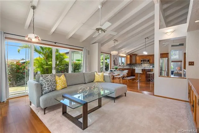 NEW LISTING! YOUR OWN PRIVATE OASIS! Immaculate, move-in ready home on an elevated extra-large 19,000+ square foot lot in the desirable and serene Kalama Valley neighborhood. This 4 bdrm/2 bath executive style residence offers ocean, mountain, golf course views and a super-private location with no back neighbors. Sophisticated design features include stunning Teak & Acacia hardwood floors, an updated open kitchen with granite counters, cherry wood cabinets, vaulted ceilings, and a beautifully landscaped yard. There's more - owned solar PV system (with net metering), central AC, and a soothing hot tub on the elevated deck with panoramic unobstructed views. Perfect neighborhood for walking and biking. Close to Sandy Beach, Koko Crater Botanical Gardens, Hawaii Kai Golf Course, Costco, and Maunalua Bay. Must see!
