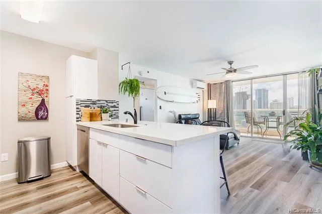 Lowest price 2 bedroom, 1 bath unit in Kakaako! This remodeled unit has been recently upgraded with split AC units throughout, new kitchen and bathroom cabinets + countertops, vinyl plank flooring, and a new water heater. This highly desirable end/corner unit has a spacious lanai off the living room and 1 parking stall. Enjoy the walkability of Kakaako's Ward Village! 1133 Waimanu is a block away from Whole Foods and South Shore Market Place, and two blocks from Ala Moana Beach Park, Ala Moana Shopping Center, and Ward Theater. This is an incredible opportunity to live in the heart of Kakaako at an amazing price.