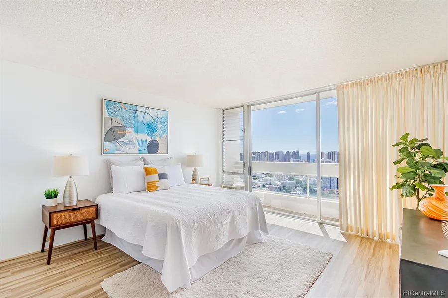 Don't miss this rare chance to secure this clean, move-in ready, 1 bed/ 1 bathroom unit in the heart of town with spectacular ocean/ city/ Diamond Head views. Also featuring updated kitchen with quartz countertop and permitted washer/ dryer in the unit. Banyan Tree Plaza now showcases revamped amenities including renovated lobby, pool area, recreation room with kitchen, etc. This is the unit you have been searching for!