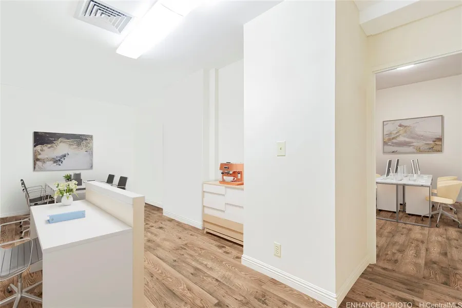 Work in Downtown Honolulu's Financial District in this multi-use BMX-4 zoned building. This 639 sqft unit is one of the LOWEST price per sqft FEE SIMPLE, units in the building WITH assigned parking. It offers the ultimate flexibility as an office or however your desire. Super high ceilings and sprinklers already installed! Separate entrances lead to a reception area with an office/storage and a kitchenette, flexible area, full bathroom and room in back. 24 hour security, pool, whirlpool and convenience provide you the perfect location from which to conduct business remotely. Photos have been virtually remodeled and staged for ideas/concept only. Floorplan dimensions are approximate.