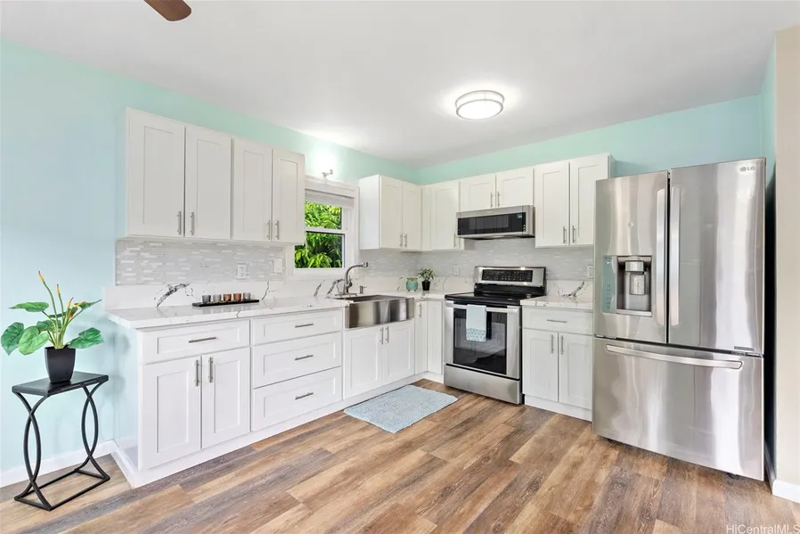AMAZING ASSUMABLE 3% VA rate! Gorgeous 3-bedroom, 1.5-bath, single-level home just moments away from the beach in the vibrant heart of Makaha! Tucked away in a quiet cul-de-sac, this gem is near Makaha Beach Park and is PRICED TO SELL! Enjoy nearly 1,000 sqft of refined, open living space on a level, fully-fenced lot. Leased 21-panel photovoltaic system paired with a Tesla battery. Fully renovated in 2021 with new windows, and luxury vinyl plank flooring throughout. The kitchen has quartz countertops, a chic tile backsplash, custom cabinets and stainless steel appliances. AC in every room. Near schools, parks, shopping, and more. Don't miss this one!