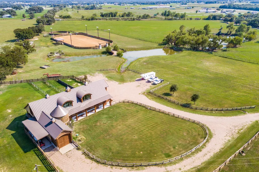 This distinctive horse property is located just minutes from the desirable town of Granbury and features all the finest characteristics of the ultimate equestrian property. Set apart from the others, the tone of this property is established by its breathtaking, unique, custom built barn home. With an elegant and rustic aesthetic, this 7-stall barn, combined with its luxurious living quarters on both the first and second levels, is perfect for the dedicated equestrian enthusiast. A handsome lighted riding arena, large green pastures, beautiful wood fencing, water features, turnouts, additional stalls etc. This one of a kind property will not last long!