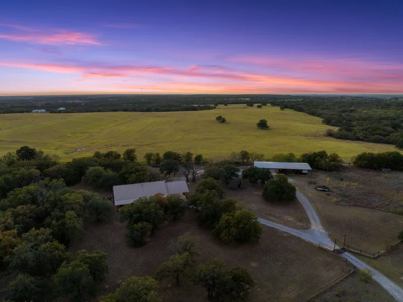 Where West Texas skies meet rolling vistas, this 12.8-acre ranch invites you to bring your horses, your dreams, and your sense of wonder. Perched at one of the highest elevations in this area of Erath County at 1,240 ft, this custom home was positioned to frame extraordinary views of open pastureland and distant blue hills. Sunsets here feel cinematic, best enjoyed from the covered porch as the world slows down around you. For the horseman, the land is a blank canvas with sandy loam soil in several areas and generous room for a full roping arena or your ideal barn setup. The acreage is fully fenced and ready for your vision. The home itself is tucked beneath a meadow of mature post oaks and was completely custom built with character and craftsmanship in every detail. Inside, wood shiplap ceilings and salvaged antique barn tin on the exterior porch ceiling bring warmth, story, and authenticity. The heart of the home is the kitchen featuring pristine custom cabinetry, a large prep area, an eat-in bar with live-edge countertops etched with turquoise, and a stunning glass display bar top perfect for showcasing buckles, silver, arrowheads, or treasures of your choice. From the sink, your view stretches across miles of open country. The primary suite offers vessel sinks, a custom marine grade wood-grain tub, and an oversized slate shower with dual live edge benches. Outside, a 1,200 sq ft workshop with electricity and four 10 ft roll-up doors expands your possibilities, and additional covered space nearby is perfect for your future horse barn. Despite its serenity, this ranch is convenient to Highway 20 and 281 with easy access in every direction. Located between Weatherford and Stephenville, two legendary hubs for performance horse professionals, you are in the heart of horse country. Close to Lone Star Arena and about an hour to Fort Worth. A setting like this does not linger. Come experience the views, the peace, and the potential.
