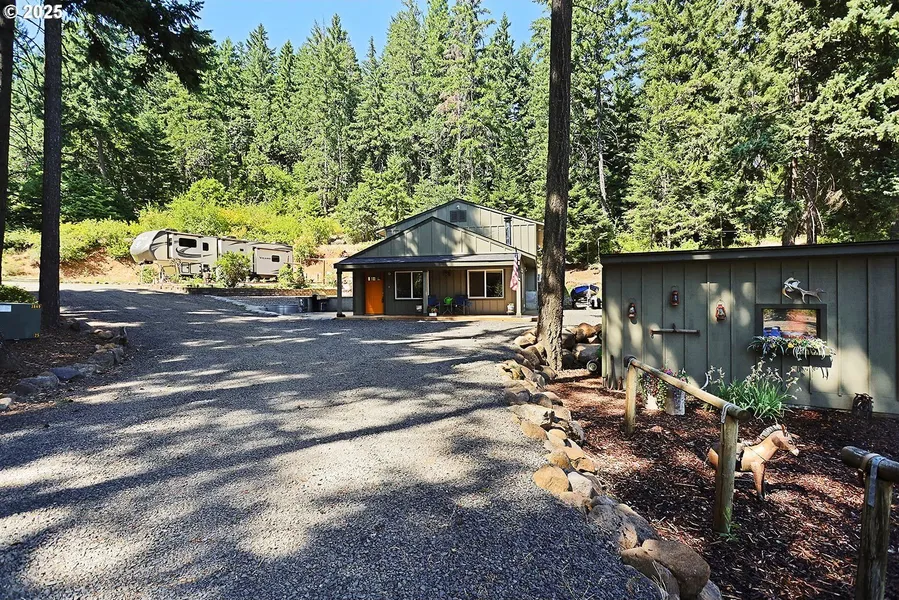 Your peaceful park like setting home awaits! Enjoy 3.27 acres with your own walking trail up to a relaxing area for picnics & sitting around the fire pit. Property has a circular driveway, grass area with picnic table, concrete patio with another fire pit. There are raised garden beds with strawberries & a plum tree, 3 storage buildings included. This property also includes 2 RV spots 1 with full hookups & the other with water and power, plus room for several more! This is a great property to have large family gatherings & room for everyone to camp. Main level is open concept with kitchen, large dining area with 2 eat at bars, large living room with surrounding windows, wood stove & tall ceiling. Kitchen has brand new butcher block counter tops & new sink, beer/wine fridge. Main level has 2 bedrooms, full updated bathroom, laundry area W/D included, large kitchen pantry. Go upstairs to y...