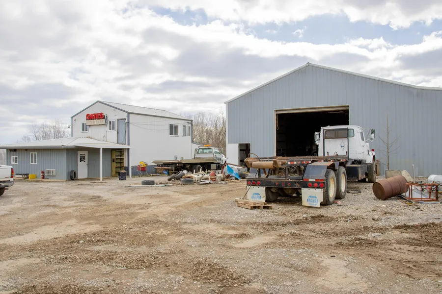 40 x 80 metal shop with concrete floors, 20 ft covered bays on side, & electricity