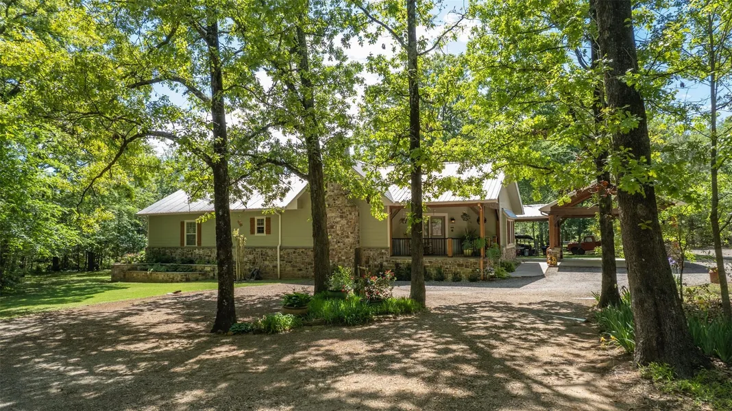 FREE HIGH SPEED internet from a host tower while enjoying a private park-like 12 acres with this 3bed, 2ba home that received a total makeover in 2012 (see doc's). Vaulted porches greet you at the front door with lots of covered decks and porches for sitting under a canopy of trees. Inside, a cathedral-vaulted ceiling with impressive cedar beams & a stone fireplace take the focus in the large family room. Kitchen includes island with eat-in dining area that also has double doors. The main bedroom, with adjoining office, comes with two separate custom-made walk-in closets, an oversized tub, separate shower, dual sinks, & French doors. Beautiful composite decking overlooks stocked pond and picnic area. Storm shelter has electricity & ethernet. House also includes high end water filtration system & solar panels. Outside is a 33x20 shop, barn & greenhouse both with electric & water, & additional gardening space. Trees include pine, plum, pear, pecan, & oaks. An oasis with all the fixings!