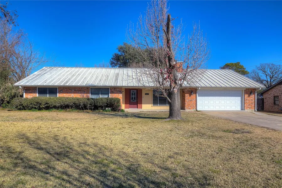 Ranch style one-story 3BD 2Bth brick home with sunroom, office and storage building. Metal roof! Space for everyone, this layout offers a huge living room with a gas log fireplace, an enclosed porch makes a perfect den or sunroom on the back, and a modern kitchen with lots of storage! Kitchen has all black appliances, gas range with oven and a wall oven, disposal and dishwasher. It features a pantry cabinet, plus a pantry closet nearby. Dining room seats 8. There is also a home office alcove area between kitchen and garage. Primary bedroom is 17x15, with plenty of room for your king-size bed plus a seating area. Primary ensuite bath has tiled walls and a tiled shower, with a cute dressing table. BDs 2&3 are nicely-sized, with plenty of room to grow as your kids grow. Hall bath has extra-long vanity counter, plus linen closet. Laundry area has room for a freezer! Enjoy family time in the backyard on the wooden deck for outdoor living, a privacy fence, and a wooden storage shed with double doors. Convenient to I-30 and our awesome downtown, plus easy commute is 90 minutes to DFW. Great potential for Investors or is an affordable home and make it your own design.