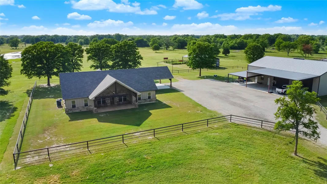 Stunning 3 bedroom, 2 bath custom estate nestled on 26.4 pristine acres just 10 miles NE of Sulphur Springs. Built in 2020, this meticulously designed home offers the perfect blend of upscale comfort, thoughtful craftsmanship, and the peace of rural living — making it ideal as a forever home, weekend retreat, or private ranch getaway. Step inside and experience a bright, open-concept floor plan with vaulted ceilings and rich luxury vinyl planks throughout. The gourmet kitchen is a chef’s dream, featuring expansive granite countertops, a double oven, custom wood vent hood, pot filler, and premium finishes that combine style and function. The home is equipped with spray foam insulation and a whole-home dehumidifier for year-round efficiency and comfort. Enjoy expansive covered front and back porches overlooking a picturesque, stocked pond and rolling pastures. Beyond the main residence, the property boasts a massive 75x75 shop with bat insulation, 6-inch post-tension concrete slab, and impressive 14’ overhead doors. Inside the shop, you’ll find fully finished living quarters complete with a full kitchen and bathroom — ideal for guests or extended family. Piped working corral and 30x60 implement shed. Underground utilities. The property includes pipe fencing and a private gated entrance, offering the perfect blend of luxury, privacy, and functionality. Whether you're watching the sun rise from the porch, working in the shop, or hosting gatherings under the stars, this property is built for a life well lived.