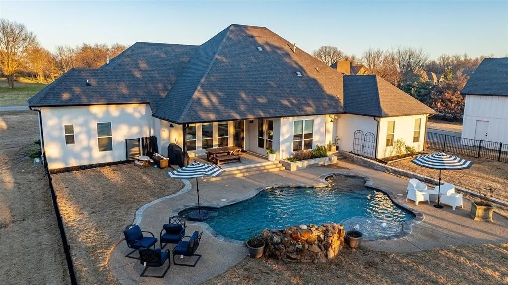 --Motivated Seller-- Luxury living with stunning sunsets comes with this refined 4bed-4bath in Stone Lake Estates! Discover the elegance of this 3,341 square-foot stucco home, with in-ground pool and 2-car attached garage, that backs up to neighboring land with fabulous views. Inside the foyer, you'll find an office with sliding doors & built-in cabinets. A wall of windows overlooks the backyard in the vaulted living room with a brick gas-log fireplace. An open kitchen includes a large island with extra seating, double ovens, gas cooktop, spacious walk-in pantry, and built-in refrigerator. Enjoy the backyard from the dining room with windows on 2 sides. All 4 bedrooms are on the first floor. Inside the primary bedroom suite, relaxing is easy with a spacious 16x21 square foot space, enough room for a sitting area. Adding to that, is the primary bathroom with a soaking tub, separate shower with white subway tiles, separate vanities, and large walk-in closet with built-ins. The 3 guest bedrooms are split from the primary bedroom and each bedroom comes with its own bathroom access. Upstairs, you'll find a 15x22 family room for additional living space, plus a game room or theater room, and an attic storage room. Entry from the attached garage includes a mud room with built-in cabinets for storing your gear and backpacks. The laundry room is a dream with hookups to a washer and 2 dryers, folding space, sink, room for a second refrigerator and great storage for your crafting materials. Outdoor living is delightful with a covered and open back patio, an in-ground pool that comes with a built-in table for eating snacks or lounging, a water feature for that bubbling brook sound and direct access to a full bathroom. For additional storage, a separate garage could be used as a workshop, basketball court, workout space, or RV parking. Sophistication is found in every corner of this spectacular floorpan that is sure to please the whole family!