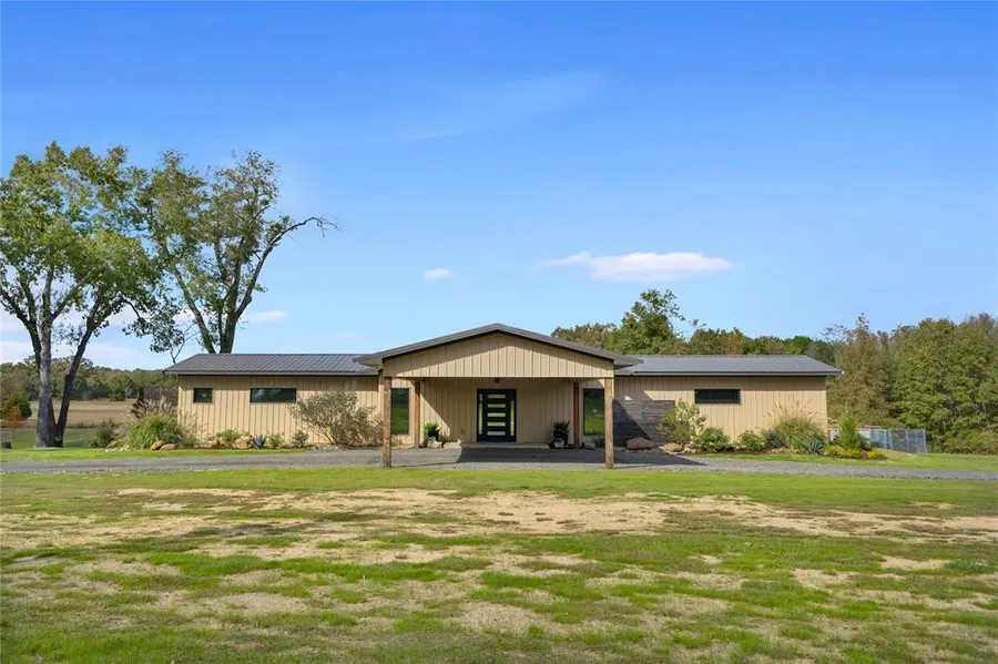 Luxury and Tranquility Await in Sulphur Springs, TX! Experience the perfect fusion of luxury and serenity in this custom-built 3-bedroom, 2-bath property, situated on 6.78 acres in the peaceful embrace South of Sulphur Springs. Designed for contemporary living, this elegant home combines high-efficiency features with scenic views that promise to soothe the soul. Step inside to discover an interior that exudes sophistication, highlighted by concrete floors and a thoughtfully designed split-bedroom plan offering both privacy and style. The expansive 9-foot ceilings and large windows welcome an abundance of natural light, presenting breathtaking views from every room. At the heart of the home, the kitchen impresses with granite surfaces, a breakfast bar, and a spacious pantry, all complemented by premium KitchenAid appliances, including a gas range. The custom lighting and solid wood interior doors enhance the home's artistic charm. Retreat to the luxurious primary ensuite, a sanctuary that promises relaxation with its private bath complete with a volcanic limestone resin garden tub, a large walk-in shower, and dual sinks. Thoughtful conveniences include a dedicated laundry closet. This home is as efficient as it is beautiful, showcasing a tankless water heater, foam insulation, and generator wiring for your comfort and peace of mind. Outside, sturdy metal siding and roofing, a 2-car carport, and a metal exterior well house. Indulge in leisure with a miniature golf setup and afternoons by the large, stocked fishing pond, where sounds of nature and wildlife create a serene backdrop. For hobbyists, a charming chicken-duck coop and room to plant a garden add delightful versatility. Plus, benefit from the propertys deep water well. Discover a harmonious blend of luxurious living and nature's simple pleasures in this enchanting Sulphur Springs residence.
