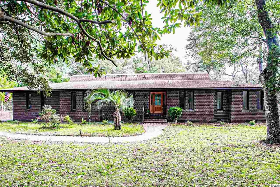 A rare, not-to-be-missed opportunity to own in the most-exclusive Briarcliffe Acres! This all-brick private estate situates itself on 1.28 acres of maturely wooded seclusion in the incorporated, 242-home town of Briarcliffe Acres nestled between Myrtle and North Myrtle Beach. This small town, to some, is merely a blip on the radar; however, with such isolated homes on nearly-impossible-to-find lots of this size and private access to the beach, the residents of this area are fully aware and brilliantly intentional in their choice to live here. Upon gaining access to this homes ocean-side of Highway 17 Business neighborhood, be sure to pinch yourself if you need reminding that this community truly does exist in the Myrtle Beach area! This property transports you via a blissful assault on all of your senses: from the decades-old trees to the scent of the ocean only a short golf-cart ride, walk, or bike ride away. A double door entry and foyer with marble-tiled flooring greats you and opens up into the sunken formal living area. A wall of wall-to-ceiling open bookcases separates this area from the spacious den with vaulted beam ceilings, a full brick wall showcasing the wood-burning fireplace, and sliding glass doors leading to the expansive rear deck. Dual access to the lovely kitchen featuring ample cabinetry and counter space is provided via the formal dining room and den. There are three bedrooms and two bathrooms on one side of the home that are secluded away from the common living areas. There is also a full bathroom between the laundry room and kitchen for guests and convenience. This home has an attached two car garage and an additional two car garage in the backyard providing plenty of space for parking, storage or a hobby. Your Briarcliffe Acres address provides you with convenient access and close proximity to all the attractions and amenities of the Grand Strand, including fine dining, world-class entertainment, and ample shopping experiences. Rest easy knowing you are only a short drive from medical centers, doctors' offices, pharmacies, banks, post offices, and grocery stores. Square footage is approximate and not guaranteed. Buyer is responsible for verification.
