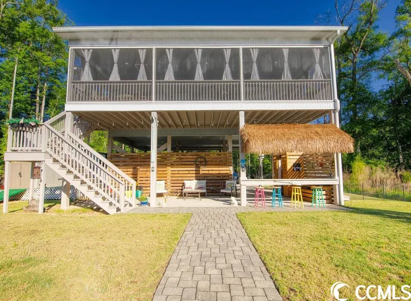 This stunning stick build house was built in 2019 and is located on the Waccamaw River waterfront, boasting two master bedrooms and two master baths. The raised home has never flooded inside. The large stone driveway can accommodate parking for multiple vehicles, and there's a fire pit to enjoy by the river. There's also an open view of the river from any of the three sliding glass doors. Premium LVP flooring can be found throughout the house and porch, along with all solid wood doors and trim. For added security, the house is equipped with inside and outside security systems that can be monitored via Wi-Fi from anywhere. The fenced-in backyard boasts premium landscaping with Tennessee River rock, palm trees, and lush grass. There's even a floating shed on a pontoon boat with storage and all yard equipment included. A full yard-length retaining river wall and private floating dock offer endless opportunities to enjoy the river. The house also features full RV hookups with 50 amp service, water, and sewer connections with a grinding station. The deck underneath the front side of the house even includes a jon boat, and there's an outdoor shower with a prep sink and a built-in black stone grill. The tiki bar with stools and elevator add to the luxurious feel. You can relax on the full-length screened-in porch overlooking the river, and enjoy cooking in the fully-stocked with anything need in the kitchen with high-end fixtures, a butcher block island with farm sink and bar stools, and a pot filler. The black stainless steel appliances add to the modern feel. The house is fully furnished from top to bottom, including all patio furniture upstairs and downstairs. The master bedroom boasts a king-sized bed, nightstands, shelves with storage, a long dresser with drawers, a walk-in closet with custom shelves, and a wall-mounted smart TV. There's even a gun safe in the master closet. The bathroom includes a soaker tub and a custom vanity. The second master bedroom has a queen-sized bed, nightstands, a long dresser with drawers, a tall dresser with drawers, a TV, and a bathroom with a tile shower and custom vanity. The closet has custom shelves. In the living room, you'll find a double reclining couch (power), a large entertainment center with a flat-screen TV, wicker end tables with storage, and a grandfather clock/gun safe. This house has everything you need to live in luxury on the Waccamaw River waterfront.
