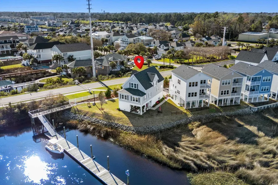 Experience coastal living at its finest in this stunning 4-bedroom, 3.5-bath raised beach cottage, perfectly positioned at the very end of the street in the sought-after Cottages at Marker 350 in Little River. Great Community NO SHORT TERM RENTALS ALLOWED!!! There are 32 homes in the community and 20 homes are primary residents and one is a long term lease and 12 are second homes!!! This three-story waterfront home, with elevator, offers unobstructed views of the Intracoastal Waterway and the iconic Swing Bridge, creating an unparalleled backdrop for everyday living. Step inside to a ground-floor foyer entry, where you can take the stairs or use the convenient 3-stop elevator to access the main living areas on the second floor. Here, an open floor plan is bathed in natural light, featuring a spacious living area, an extra sitting area, the dining area, and a beautifully designed kitchen with white cabinetry and work island/breakfast bar, and a cozy den/office space. This level also boasts the first of two master suites, complete with a walk-in closet and an en-suite bath featuring dual sinks, a garden tub/shower combo, and a sitting area at the vanity. The third floor is home to the 2nd master suite, where you’ll wake up to breathtaking water and marina views. This suite includes two closets and a newly tiled walk-in shower in the en-suite bath. There area also two additional guest bedrooms on this level that share a convenient Jack-and-Jill bath. The construction is 8x8 Pilings on slab throughout the entire home!!! Designed for both comfort and accessibility, this home features 9-ft ceilings, 36-inch doorways on all three levels, and grab bars in both master baths. Flooring throughout consists of porcelain wood-design tile, ensuring both durability and easy maintenance. Additional highlights include Interior 3 stop elevator measuring 36"x40" and is 6'6" tall, Two garage bays with space for three cars plus a storage room, Covered patio to relax and watch the boats go by, Laundry room with a pantry plus additional cabinetry and a butcher block countertop. Recent updates: New water heater (2024), exterior trim repainted (2024), elevator motor (2024), and full gutter installation (2020) This home is just steps from the private community boat dock, allowing for temporary docking, and a short stroll to the community pier with a picnic area. The HOA includes lawn maintenance, making it easy to enjoy the golf cart lifestyle with just a short ride to the beach, shopping, dining, and entertainment. Don’t miss this opportunity to own a rare waterfront gem in Little River—schedule your showing today!