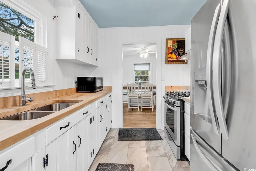 THE LOCATION! Steps to the beach, No HOA! Furnished! Located in the Long Bay Extension area of Myrtle Beach, between Grande Dunes and Golden Mile. You are within walking distance to Starbucks, River City Café, Dunkin Donut, plus tons of shops and restaurants. This adorable beach cottage was recently renovated and sits on high ground nestled under gorgeous sprawling shaded oak trees, surrounded by azaleas, with tons of southern charm. This rare to find 2 BR/2BA has a large sun porch with NEW Windows and climate control HVAC. Many upgrades were done in 2020, including a large detached 2.5 car garage with attic space plus 2nd door exiting to a back paved alley. More upgrades include: NEW windows in Sun Room (Replaced in 2025), Metal Roof, HVAC, duct work, electrical, plumbing, added an extra bathroom with walk in tile shower, laundry, (washer and dryer convey), tank less instant hot water heater, all new SS appliances, natural gas range, garbage disposal, butcher block, paver walkway and banisters, new windows, new doors, propane hook up in LR to add a gas fireplace, painted walls and smooth ceilings, back concrete patio and walkways, plus you have tons of parking! Need to park an RV and boat it's no problem! There's an outdoor shower! This is a rare find, with a large lot, so close to the beach! This charming beach bungalow will get snatched up real fast! All upgrades are listed in the associated docs. OWNER FINANCING AVAILABLE