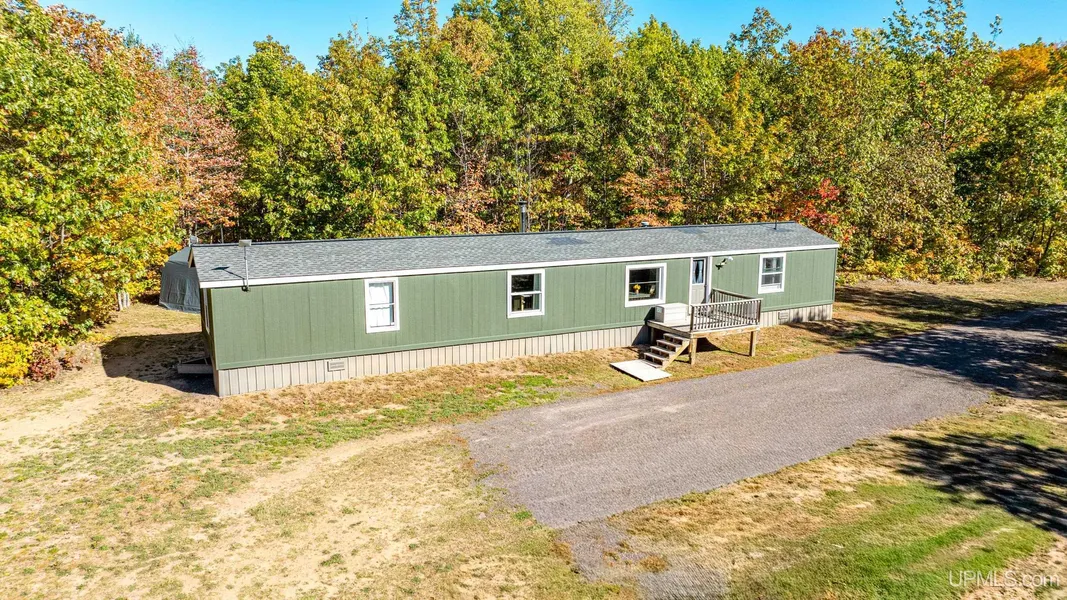 This property offers an excellent opportunity to establish your residence while constructing a new home in another location of this approximately 10 acre parcel in Stanton Township. The existing 1990 Schult Winter Model manufactured home features three bedrooms, two bathrooms, a kitchen, and a living room equipped with a Jotul woodstove. The home has been well maintained, including recent updates such as exterior repainting, installation of a ridge vent on the roof, refrigerator, washer, dryer, living room and primary bedroom ceiling fans, outlet for potential whole house generator and transfer switch installed at power pole, and addition of a woodstove within the past four to five years. It also benefits from 2x6 walls and enhanced insulation in the crawlspace. The septic system has previously received approval for a future four-bedroom residence on the property, and the current manufactured home is positioned to allow for occupancy during new construction. Additional storage solutions include a 40x8 ft (approximate ceiling height of 8'10") shipping container and a reinforced ShelterLogic tarp-covered shed. The land is attractively wooded and features some trails, raspberries, and blackberries. Located roughly 10 miles from Michigan Tech's campus, this parcel resides within Stanton Township, which is noted for its lower property tax millage rate compared to surrounding areas. ---- Negotiable: 2 portable air conditioning units, treadmill, Starlink equipment, cell booster and freezer. ------- Available separately (inquiry about pricing, if not sold prior to an offer) a tractor with snowblower, bucket, brush hog mower and box blade. ----- NOTICE: All information believed accurate but not warranted. Buyer recommended to inspect & verify all aspects of the property & bears all risks for any inaccuracies including but not limited to estimated acreage, lot location/size, square footage, utilities (availability & costs associated). Real estate taxes are subject to change (possibly significant) & municipality reassessment after sale. Buyer should NOT assume that buyer's tax bills will be similar to the seller's current tax bills. Audio/video recording devices may be present on property and entering the property shall be considered consent to be recorded. OFFERS: 72 hours response time requested on offers. Seller, at seller's sole discretion, with or without notice, reserves the right to set and/or modify offer submission & response deadlines.