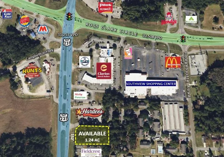 1.24-acres with 152' frontage on Hwy-231 S, just off Ross Clark Circle, situated between Hardees and the entrance to Fieldcrest Apartments. Great opportunity for commercial development. Additional 0.7-acre lot available located behind Misky Peruvian Latin Restaurant. Near Southview Shopping Center, Patricia Bowling Lanes, Ollie's, Roses, Clarion Inn & Suites, Hardees, Main Street Family Care, Walmart Supercenter, McDonald's, Dunkin Donuts, CarMart, & more. AADT on Hwy-231 S: 31,257 vehicles per day.