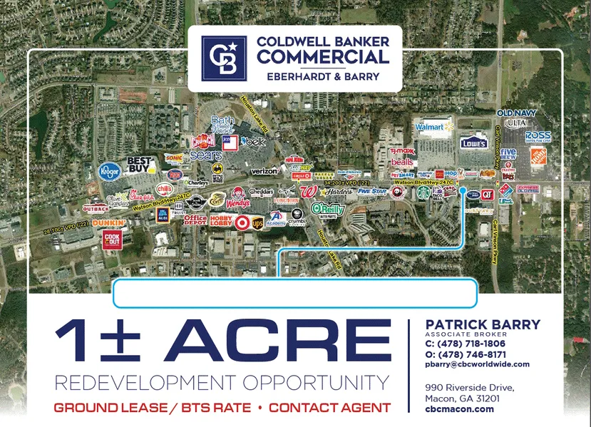 1± Acre Retail Development Site 202’± Frontage on Watson Boulevard 200± Frontage on Westgate Street Average Daily Traffic Count: 34,200± Vehicles per day (GDOT 2022) Topo: Level, at road grade All public utilities serve the site Zoned C2, General Commercial District