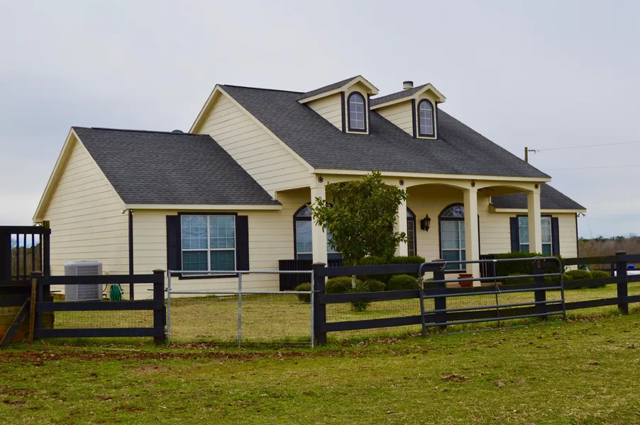 This beautiful custom built three bedroom, two bath home sits off the county road on pretty pasture land. It has a nice entrance, attractive vinyl fencing, and the inviting front porch says, "WELCOME!" This home has soaring ceilings, beautiful fireplace, and a large living area. The kitchen has pretty cabinets, stainless appliances, and attractive counter-tops. The den area upstairs could be a large game room or office. The secluded master suite has it's own private bath with two vanities, large walk-in shower, and two walk-in closets. The guest bedrooms share a full bath. The entire home has wood and tile flooring throughout. Outdoors, there is a nice 40' x 60' shop, large hay barn, pretty rolling terrain, a live creek, and the property is fenced for horses and cattle. Call us today to see this beautiful ranch!