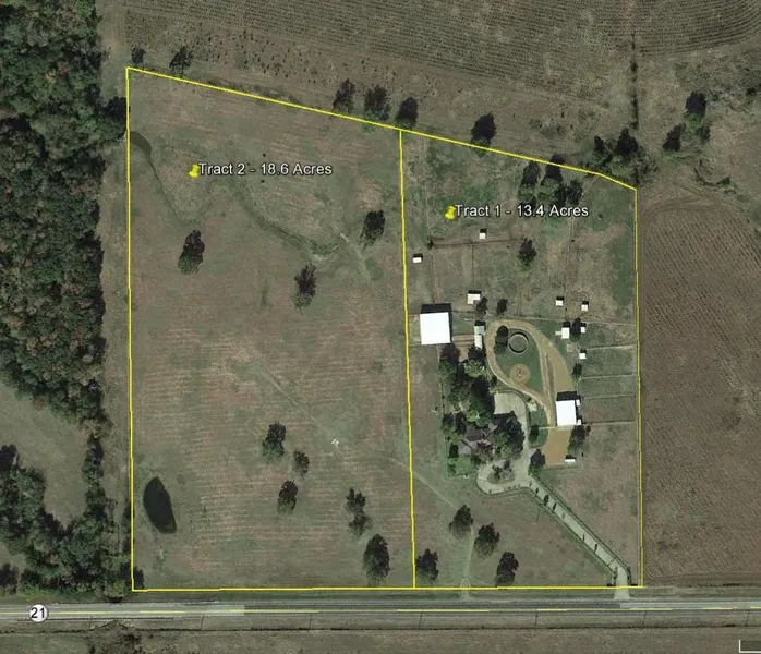 This is Tract 2, 18.6 Acres with improvements. Adjoining Tract 1, 13.4 Acres with custom home and other improvements also sells. Total of 32 Acres will sell at Auction.