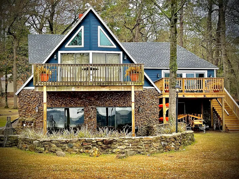 This spacious property is not your typical lake house pretty wood beams, high ceilings, and native rock add a touch of whimsy to this bright and beautiful home! This custom built three-bedroom, two bath, two-story home has plenty of room for friends and family is built for entertaining. Downstairs has a pretty kitchen with bead board paneling, stainless steel appliances, butcher block countertops, apron sink, great storage, and an adjacent breakfast area. There is a large dining area with great views of the lake and a floor to ceiling rock fireplace. There are two bedrooms, one full bath, and the utility room on the lower floor of this home. Upstairs on the main level, you will find the master suite and bath., as well as a large family room for relaxing, watching TV, and enjoying views of the lake. The sellers have recently completed the addition of a casual sitting area decorated with a nautical theme that overlooks a new deck and the lake, this would be the perfect spot for morning coffee or a kids play area. This home has been updated with some windows and doors being replaced with energy efficient fames and glass and some wide plank wood flooring added to several rooms on the main floor. The roof was replaced approximately one year ago. The large yard leading to the covered pier and boat dock with lifts is ready for your family, friends, and watercrafts! Call us today to see what Houston County Lake has to offer!