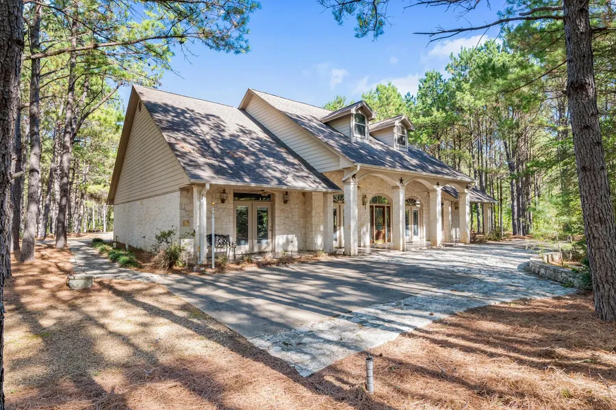 This beautiful, custom home nestled in loblolly pines wont last long! Consisting of three bedrooms and three and one-half bathrooms, this stone home on 2-acres, is well-built and well-maintained. You will be greeted by an attractive front porch leading into the impressive layout of this home. The open living concept is meant to entertain and host all your family and friends. The stone fireplace is the focal point of the large living area and is flanked by French doors leading to the covered patio. There is a half bathroom conveniently located in the living area for guests. The spacious dining area and kitchen, both have French doors leading to the front porch, giving you an abundance of natural lighting. The kitchen is a cooks dream with a large eat-in island and great counter space topped with black granite. The custom cabinetry is gorgeous and compliments the stainless-steel appliances. The oversized primary suite has a bay window, perfect for a reading nook, and French doors leading to the covered patio. In the private bath, you will find a large walk-in closet with tons of shelving, his and her sinks, and a large garden tub. The two guest bedrooms will give your guests plenty of privacy. Each bedroom has large walk-in closets, French doors leading to the patio, and private ensuite bathrooms with walk-in showers. Outdoors, you will enjoy relaxing on the spacious patio area. The Porte Cochere is great for parking multiple vehicles, and there is an outdoor storage closet for all your yard equipment. There is also a large metal covered work area with enclosed shop for additional storage. This property has it all, call today to schedule a private tour.