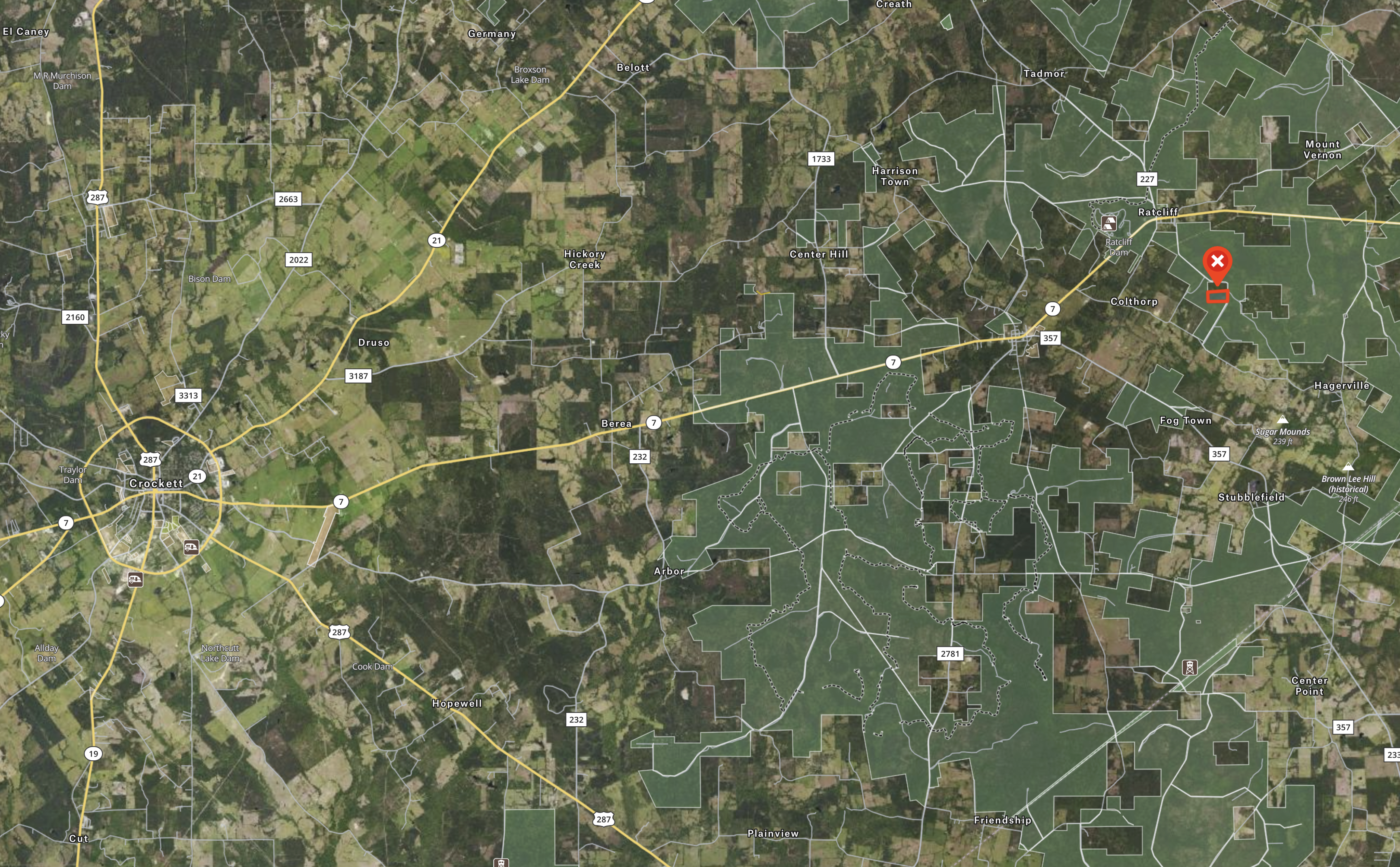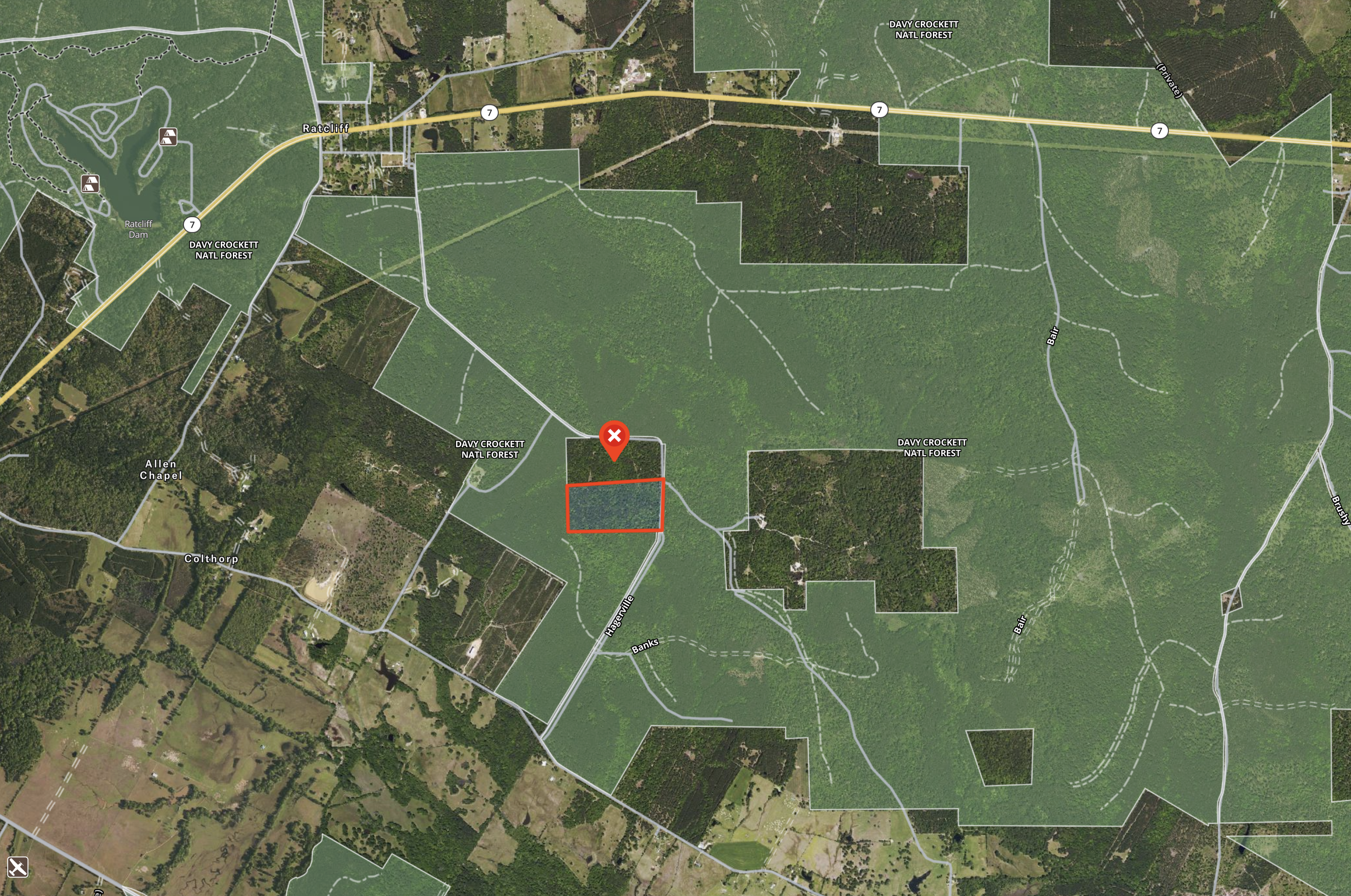 Massive hardwood trees are scattered throughout this land. Choice underbrushing would expose the large over-story that these hardwoods provide. Two drains are located in the front of the land, but they are only 2-3ft in width, and all the water is contained within these drain beds, with 0% floodplain along this area. These drains would also be perfect for building a pond, with the watershed keeping the water nice and healthy. Additionally, the land rises steadily up a hill as you make your way to the back, providing the perfect opportunity to establish your home site far off the road on the main ridge top, directly next to the national forest. Walk off your property and directly into the 10,000+ Acre section of Davy Crockett National Forest, to hunt, hike, explore, camp, and much more!
