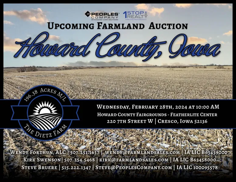 Howard County, Iowa Farmland Auction - Mark your calendars for Wednesday, February 28th, 2024, at 10:00 AM CST! Peoples Company and 1 Stop Realty are pleased to be representing the Dietz Family in the sale of 196.38 acres m/l of high-quality central Howard County, Iowa farmland with 189.60 NHEL FSA tillable acres, which includes 180.20 acres m/l of current farmland acres carrying a CSR2 value of 83.7. The primary soil types include Clyde silty clay loam, Schley silt loam, Floyd loam, and Oran loam. This land has been owned by the Dietz Family for decades and this is the first time its been offered for sale to the public. The farm has been operated by a long-term reputable local farm tenant who has served the Dietz Family as an outstanding steward of the land. Not often does a high-quality farm like this come for sale in this excellent farming neighborhood!
