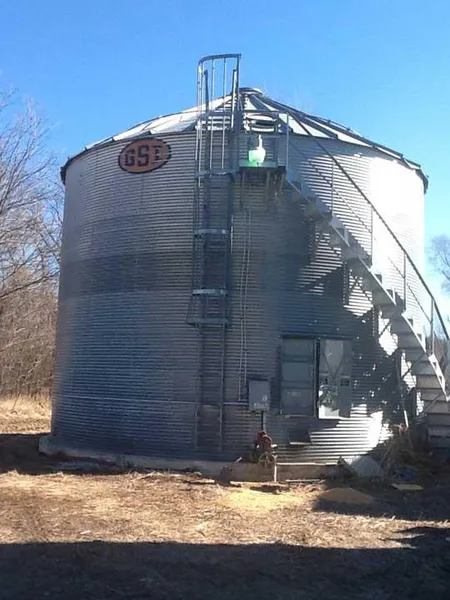 One 30' x 8 ring (10,000 bushel) GSI bin with 3 screw stirator, perforated floor, fan and heater, outside stair and horizontal unloader.