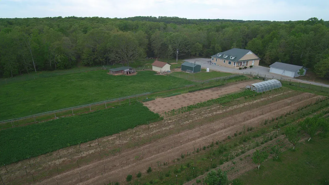 Home for sale in the Ozarks of southern Missouri. This home on 26 acres is surrounded on three sides by thousands of acres of Mark Twain National Forest. The property has large established gardens & orchards with hundreds of varieties of fruit trees & vegetables. The 3 rows of blackberries are each 315 feet long. There is a grape arbor & bee hives on the property & an abundance of acreage for outdoor activities. The property has 3 large workshops with water and electric and is set up for self sufficiency. The covered patio & the sunroom offer private areas for entertaining or enjoying the scenery in all seasons.