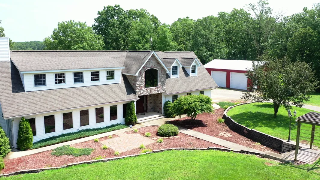 The main home is on 183 fenced acres, with123 acres of pasture and 60 acres of mature timber--red and white oak, cedar and walnut. There is lots of live water with creeks and 3 springs, one of which is the original water source from when the land was homesteaded. This one feeds into a goldfish pond, and, along with another spring in the pasture, is so cold that watercress grows wild. A third spring is in the pond below the house. There are also 9 ponds-- the biggest one stocked with catfish! This top-notch farm includes a 30X40 shop with a bath, water and concrete floors; a 40 x 50 barn with hayloft, office and horse stall; and an abundance of wildlife to enjoy.
