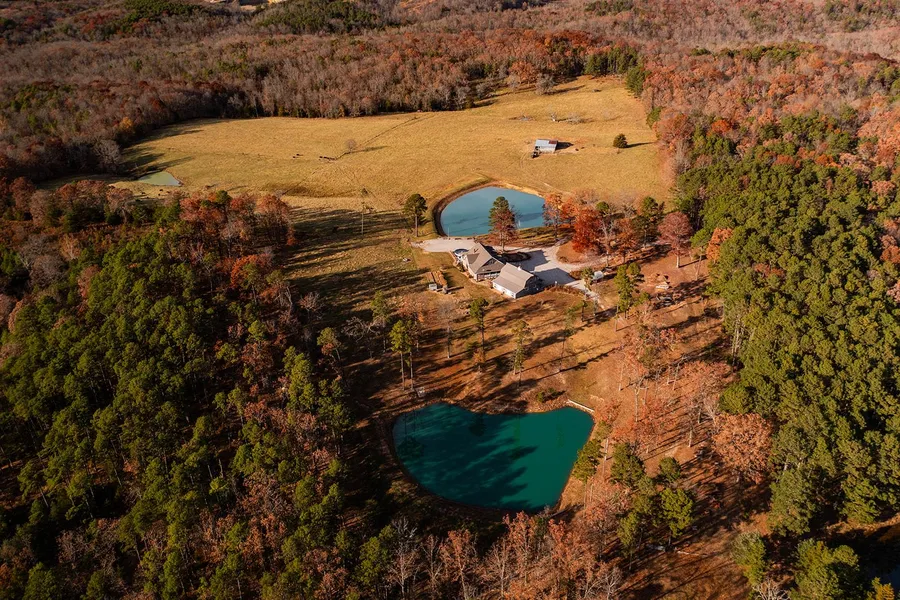 Welcome to your Ozarks oasis, a haven of serenity and luxury that beckons you to experience the epitome of country living. Nestled on a sprawling 60-acre m/l property, this custom home is a testament to craftsmanship and elegance, boasting an impressive 3947 sq ft of meticulously designed living space. As you approach, the charm of the residence is immediately evident, with a wraparound porch that invites you to take a leisurely step into the tranquility of your new home and mature landscaping. Inside the home unfolds into a spacious retreat, featuring 4 bedrooms and 3.5 bathrooms. The interior exudes warmth and character, adorned with gorgeous woodwork. The gourmet kitchen is a chefs dream which beckons culinary enthusiasts with its retro style appliances, creating an ambiance that marries functionality with style. The utility room is generously spacious and equipped with an extra oven and refrigerator, perfect for entertaining. Step outside, and you'll find a charming landscape. This property features well-thought pasture areas that are fenced and include 6 cross-fenced areas to optimize hay production and livestock grazing. Lush pastures surround the home, creating an idyllic scene. You'll find two stocked ponds stocked with catfish, bass, and perch. As well as one spring-fed pond, and a creek throughout the land. Outbuildings to include a massive 3 car garage hand built with logs harvested from the property an 1120 sq ft unfinished loft, a tool shed, garden area, and a barn. This is an incredible opportunity to own a special piece of property that has never been on the market.