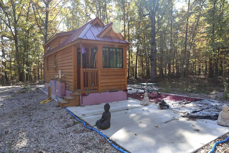 Tumble Weed Tiny Home located in the Ozark Mountains of Southern Missouri . Property boasts private setting with mature trees and a 3.5 acre lake. The property joins with Ozark Retreat Center, which is a 66 acre sustainable campus consisting of cleared fields and woods. This tiny home also offers the comfort of a storm shelter.