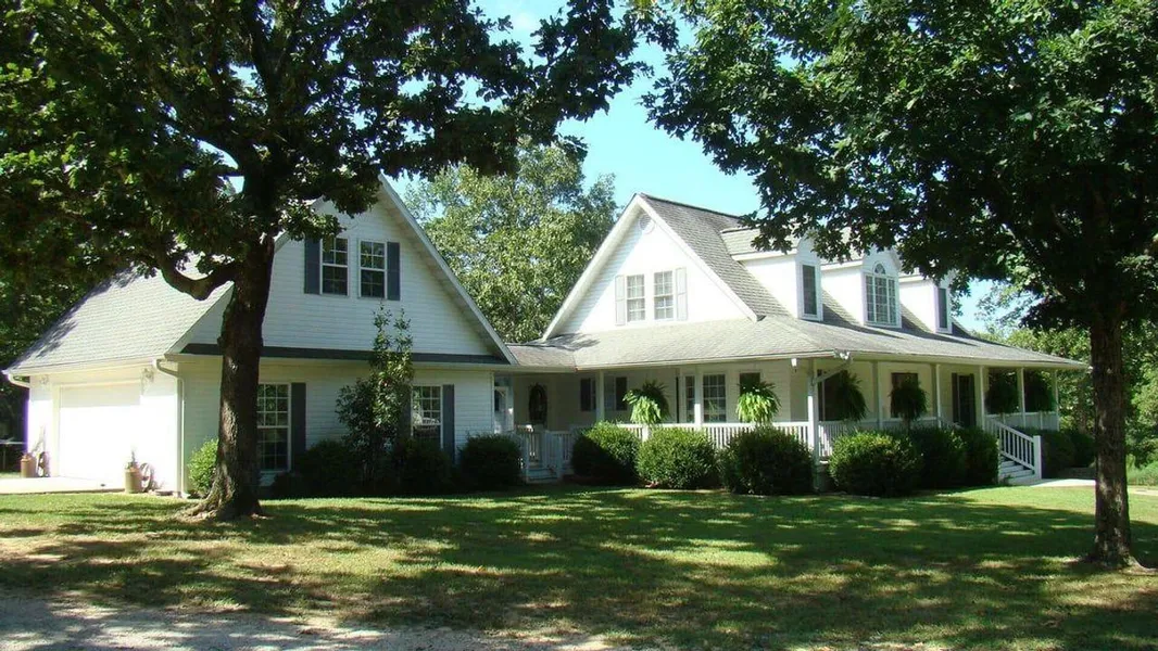 Custom & Quality home for sale in the Ozarks! This home is on 15 Acres with beautifully manicured lawn and just minutes from town! This is a 3 bedroom, 2 1/2 bath home with vaulted ceilings, large master suite, washer/dryer hookup on main level and in basement, covered country front porch and 2 car garage with loft. Home sits back into the property. Property includes pond, 24x32 shop building, 16x24 metal building, mature shade trees.