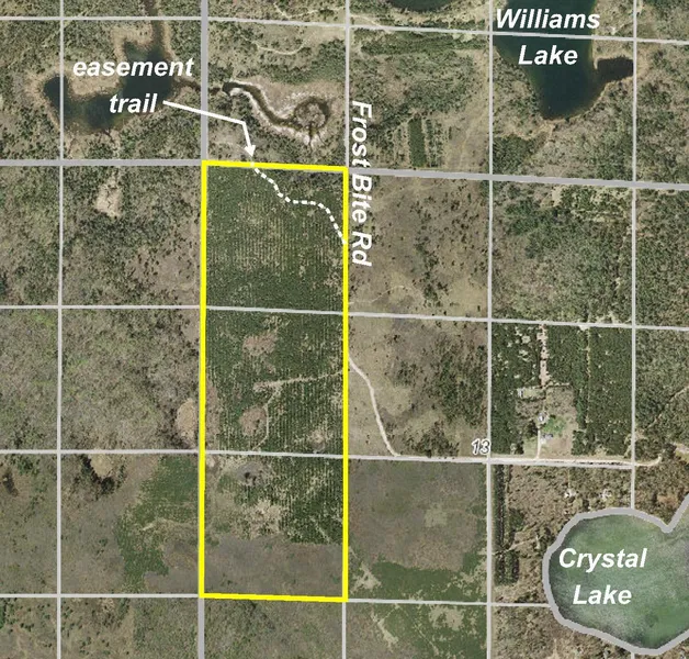 Subject to Frost Bite Rd. Subject to easement in NE corner. Photos and maps are for convenience only and are not guaranteed; tree cover may be different than depicted. Physically inspect the property prior to purchase. Not surveyed nor corners marked. If deer stands are located on this tract, they are not the property of Seller and are not included in the sale. Use seller-approved purchase agreement & addendum; closing dates the 2nd Wednesday of each month.