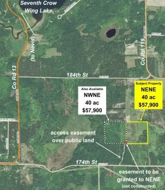 Priced well below county's estimated land value! Own up to 80 acres of Potlatch land south of Nevis and 7th Crow Wing Lake. This 40-acre parcel of hilly upland is wooded with varying ages of red pine plantation. Good access via easements off a well-traveled township road. Surrounded by hundreds of acres of public land and large tracts of privately-owned land for great privacy. Badoura State Forest, the Crow Wing Chain of lakes, and Lake Belle Taine are only a few miles away, while Park Rapids and Akeley are only a short drive away for additional amenities, necessities, and recreational opportunities.