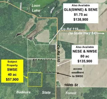 40 acres of Potlatch land near Loon Lake south of Nevis and Akeley. Gently-sloping upland wooded with red pine leans toward wetland area in the northwest corner. Only three miles from State Hwy 64 and accessed by an easement from Co Rd 110 over adjoining property to the north. A trail continues diagonally through the tract as well. This property adjoins public land on the west and abuts the Badoura State Forest boundary on the south. Combined with one or both of the adjoining tracts available to the north would give you over 200 acres of wilderness to enjoy throughout the year!