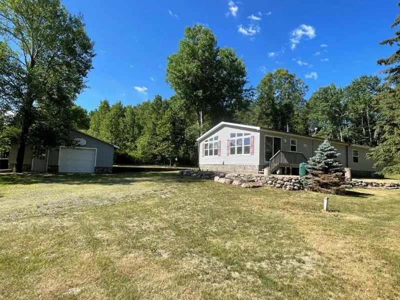 Private 9+ acres south of Bemidji with a very clean 3BR/2BA manufactured home built in 2002. Family room is highlighted with a Wilkening wood burning rock fireplace. 1800+ sq ft has central air and master suite. Large kitchen includes breakfast bar & abundant cabinet & counter space. Heated over-sized single stall garage with lean-to. Beautiful trees and landscaping surround this light filled country home.