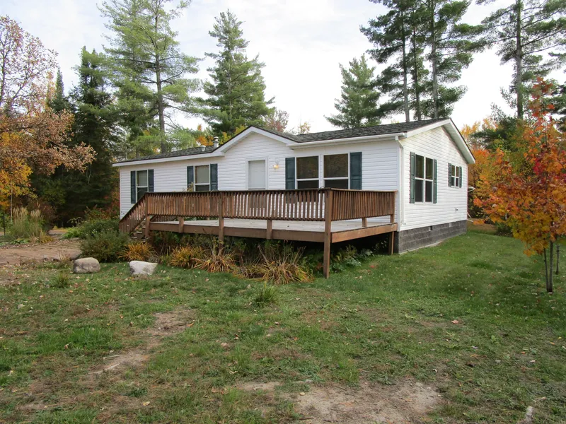 Beautiful 5 acre wooded parcel with white pine and hardwoods. 3BR/2BA manufactured home with a 3 stall garage, paved drive, perimeter concrete foundation and a nice entryway. Paved road and lots of privacy.