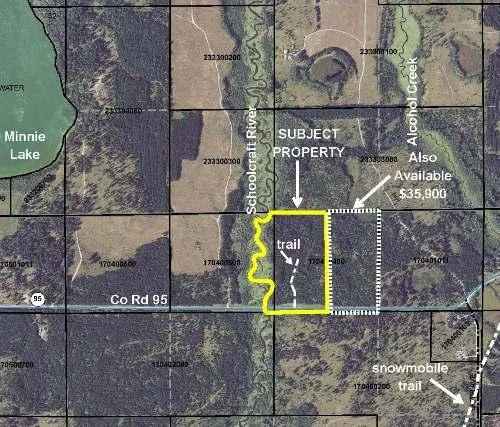 Approximately 25 acres with about 1940 feet of Schoolcraft River shoreline. Located right on Co Rd 95 north of Lake George. A trail leads northerly toward the center of the property. Near Minnie Lake and Alcohol Creek and within the Paul Bunyan State Forest. Snowmobile trail to the east/southeast. Majority of the tract is level upland within shoreland zone. Excellent site for camping or hunting. Public land adjacent to the north is in Schoolcraft Township/Game Refuge (no firearm hunting). Contact Hubbard County or Lake George Township for building restrictions. Additional land is also available (MLS# 201644).