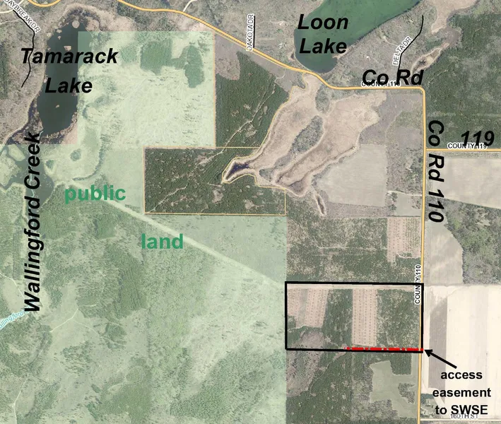 80 acres of Potlatch land near Loon Lake south of Nevis and Akeley. Fairly-level to gently-sloping upland wooded with varying ages of red pine lean toward a small wetland area in the southwest corner. Good county road frontage less than three miles off State Hwy 64. Will be subject to an easement over a portion of the south boundary providing access to adjoining property to the south (SWSE). A powerline along the north side offers great open shooting lanes for hunting. Public land adjoins the west side and connects with the Badoura State Forest. Combined with one or both of the adjoining tracts available to the north and south would give you over 200 acres of wilderness to enjoy throughout the year!