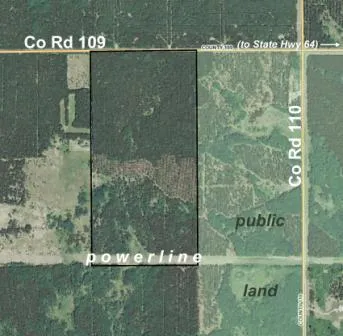 Potlatch property just outside of the Badoura State Forest south of Akeley. Generally-level upland with a touch of lower wetland in the south. The land is mostly wooded with jack pine but also has a band of red pine in the south half; the timber could possibly be thinned or harvested within the next five to ten years for potential timber value. Powerline running along the south boundary offers great shooting lanes for deer hunting. Good access via gravel Co Rd 109 less than three miles west of State Hwy 64. Over 1,000 acres of public land adjoins the east for lots of hunting, hiking, and 4-wheeling area. There are numerous snowmobile trails in this area as well. Akeley and Backus, with the Crow Wing Lake chain and Pine Mountain Lake, are each just over a 20 minute drive for groceries, dining, and supplies.