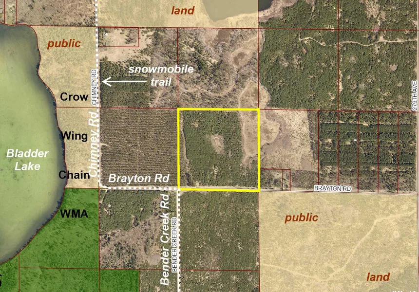 PotlatchDeltic land by Bladder Lake and Crow Wing Chain WMA south of Nevis. Upland wooded with red pine slopes to wetlands in the center and east side. Township road along the south side for access. Public land across the road to the southeast, and Crow Wing Chain WMA, where there has been emphasis on enhancing waterfowl nesting and food production, is only 1/4 mile west. Snowmobile trail along Chimney, Brayton, and Bender Creek roads is Nevis Wilder Trail #287 and is part of MnUSA Corridor #67 and Nevis TrailBlazers system that connects to Heartland State Trail, trails in the Paul Bunyan State Forest, and many others. Utilities are available so this could be a great building site with lots of hunting space in prime hunting country!