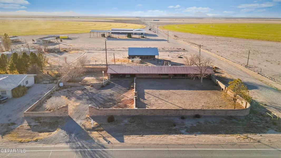 At the corner of Russell and Main St, you'll find this charming farmhouse surrounded by fields & vineyards. It's located in a tranquil neighborhood, and the very last home as you're driving through Dell City. If you've been dreaming of a place to watch the sunrise, you can do that on the 90-foot-long, tiled front porch. Inside you'll find 3 bedrooms, each with their own bathroom plus a newly remodeled half bathroom. There is a steel-structural beam that runs through the entire house and there are beautiful wood features throughout plus vaulted ceilings. In the living room, there is a unique built-in art piece of the Guadalupe Mountains and a beautiful stone fireplace. Sitting on 1.28 acres and out back there's plenty of storage under the 2500 sq ft. Airplane hangar/Barn. There is a 7 foot fenced in area in the backyard for pigs and chickens, secure from coyotes. Exactly 1 Hour Drive to Blue Origin - from house to gate. Washer, dryer and refrigerator are staying. The main electric panel has been updated.